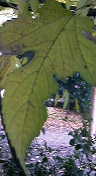 葉っぱは5本指。15cmくらい。葉脈は根元からそれぞれの指に向かっている。 その先は互生。